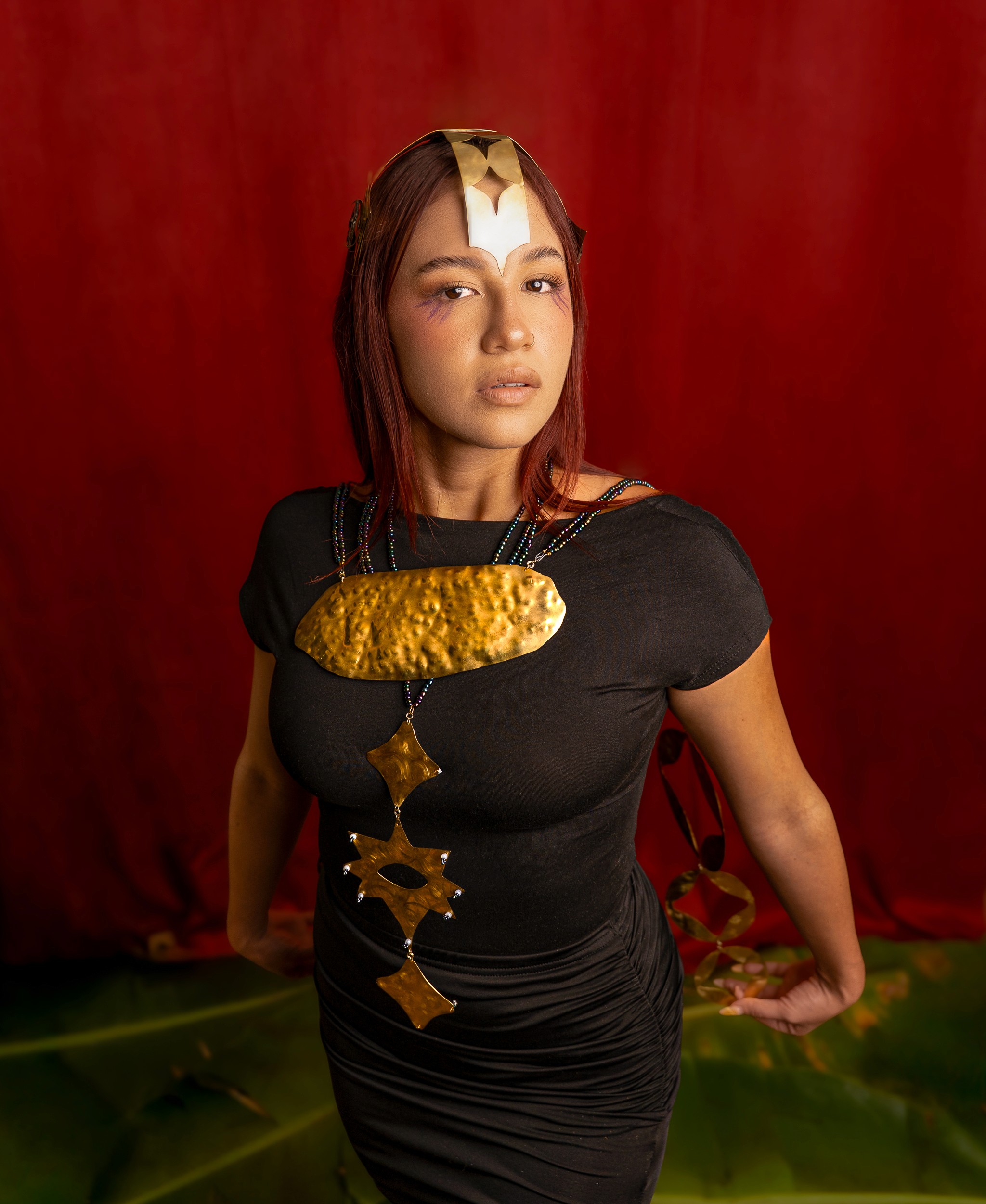 Esencia Celestial explora la divinidad femenina en equilibrio con la androginidad angelical, integrando lo masculino y lo femenino en un solo símbolo. Esta propuesta trasciende lo binario para manifestarse como un principio universal de unidad y espiritualidad.Se emplearon calados para evocar los ojos infinitos de los serafines, símbolos de visión y misticismo. El latón fue trabajado con percusión y texturas circulares aplicadas con dremel, generando superficies etéreas y vibrantes. Cada huella en el metal actúa como signo celestial, un eco tangible de lo divino.