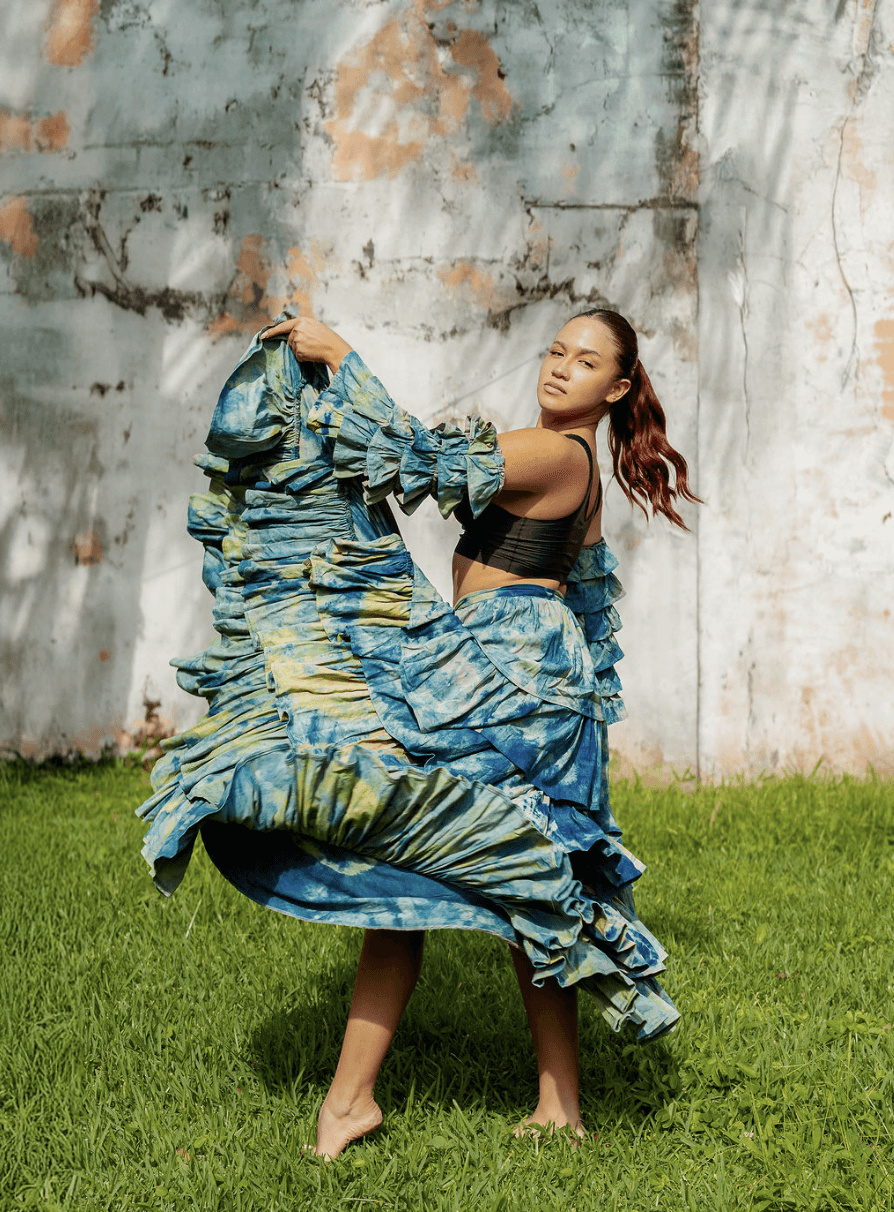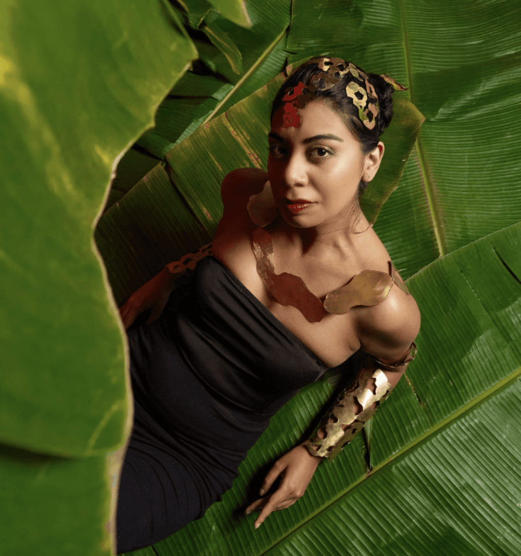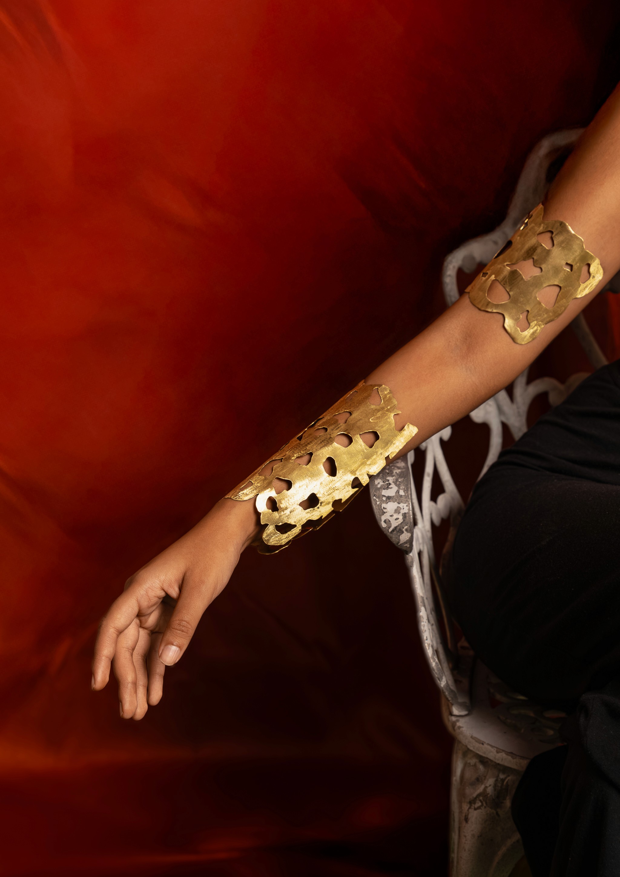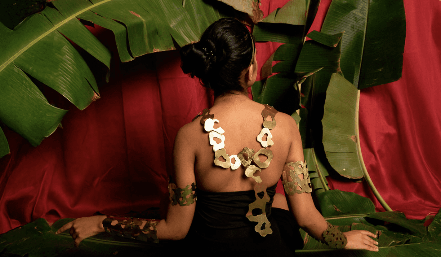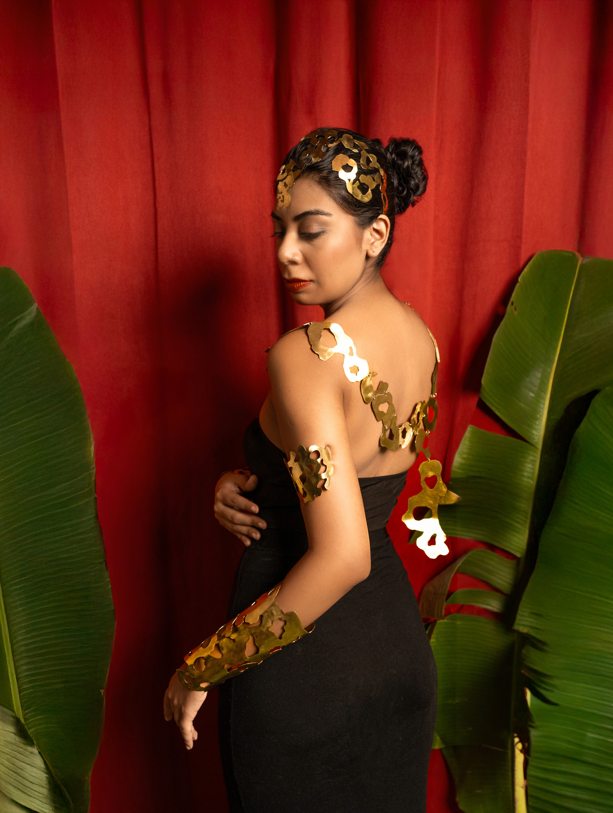 surge como una guerrera celestial, uniendo lo divino y lo terrenal en la figura de un nahual jaguar. Indómita y desafiante, encarna la fuerza de la selva y el fulgor de los astros. Es diosa y mujer, espíritu y fiera, un símbolo de poder que recuerda que el coraje se revela en la lucha contra el caos, reclamando con garras y fuego su lugar en la eternidad. El proyecto se materializó en latón, dando vida a cuatro piezas que conforman un look total de guerrera jaguar: una corona inspirada en las manchas del felino, un collar que recorre la espalda como un manto de fuerza y cuatro brazaletes que evocan su huella en cada brazo. Conjunto que transforma el cuerpo en la piel indomable de Ixchamal.