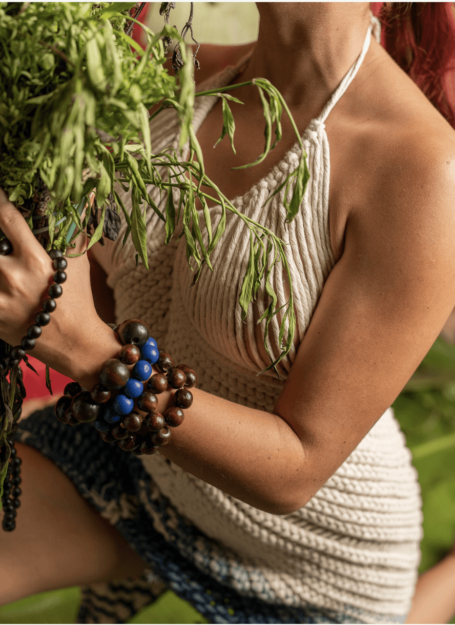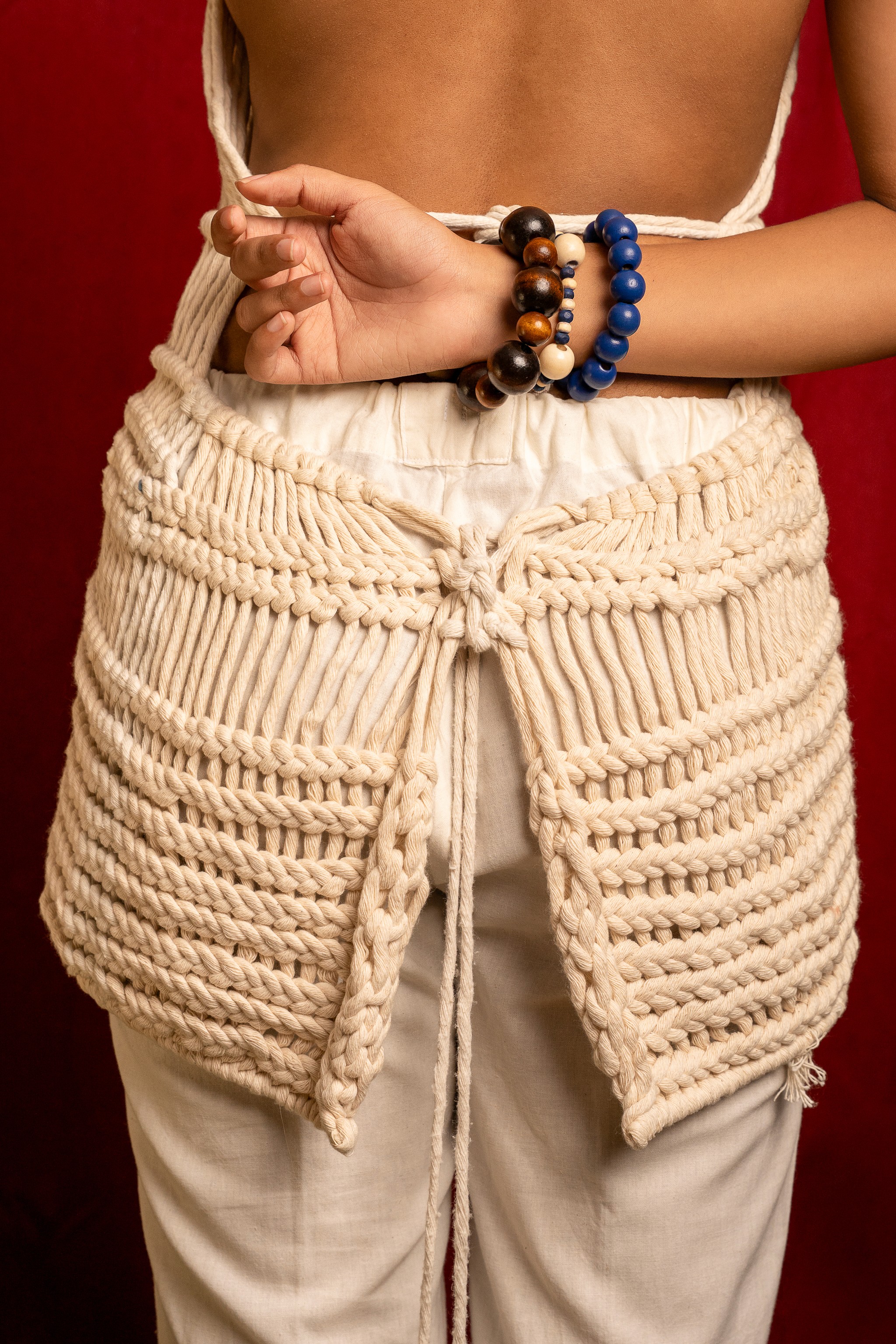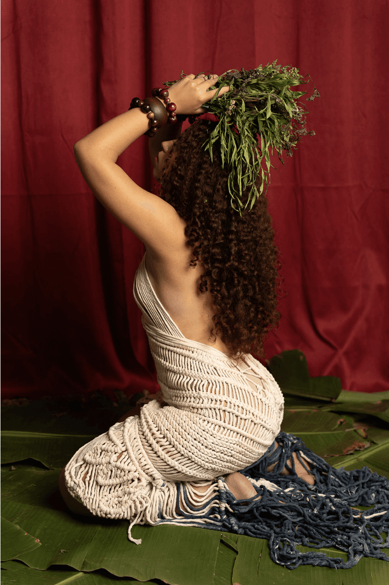 Yólot Xoxotic, una colección inspirada en la botánica y en la figura de las curanderas y brujas herbolarias, mujeres que transformaban hierbas, aromas, especias y alimentos en remedio, pero que por ello fueron consideradas brujas. La propuesta se materializó en cuatro looks: tres principales que conforman el aquelarre de brujas y un cuarto que complementa la narrativa. Cada pieza fue concebida con la técnica de macramé, símbolo del trabajo manual cargado de energía, intención y ritualidad.